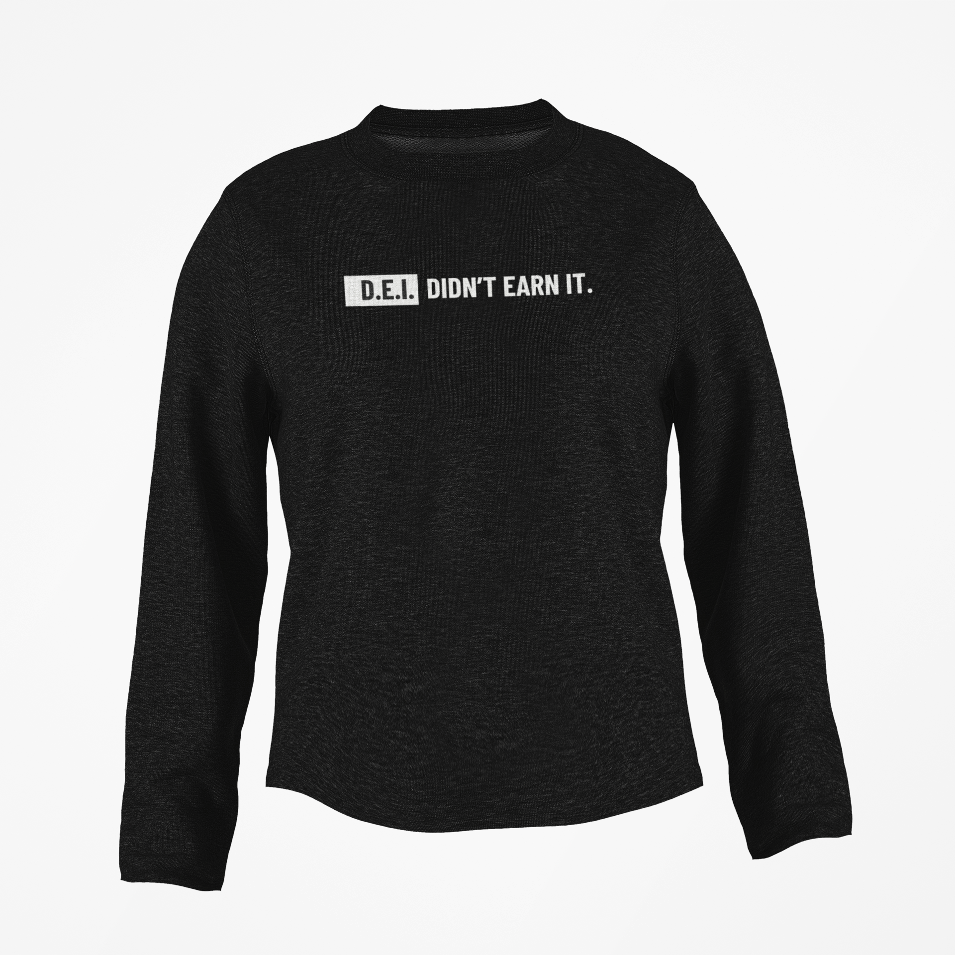 Make a bold statement with our D.E.I. Didn’t Earn It Crewneck — a clean, unapologetic design for those who believe in merit, excellence, and earned achievement. Printed on a deep black crewneck with crisp white typography, this piece delivers a sharp, minimalist look with a message that hits hard. Soft, durable, and perfect for everyday wear, it’s built for those who stand firmly on principle.