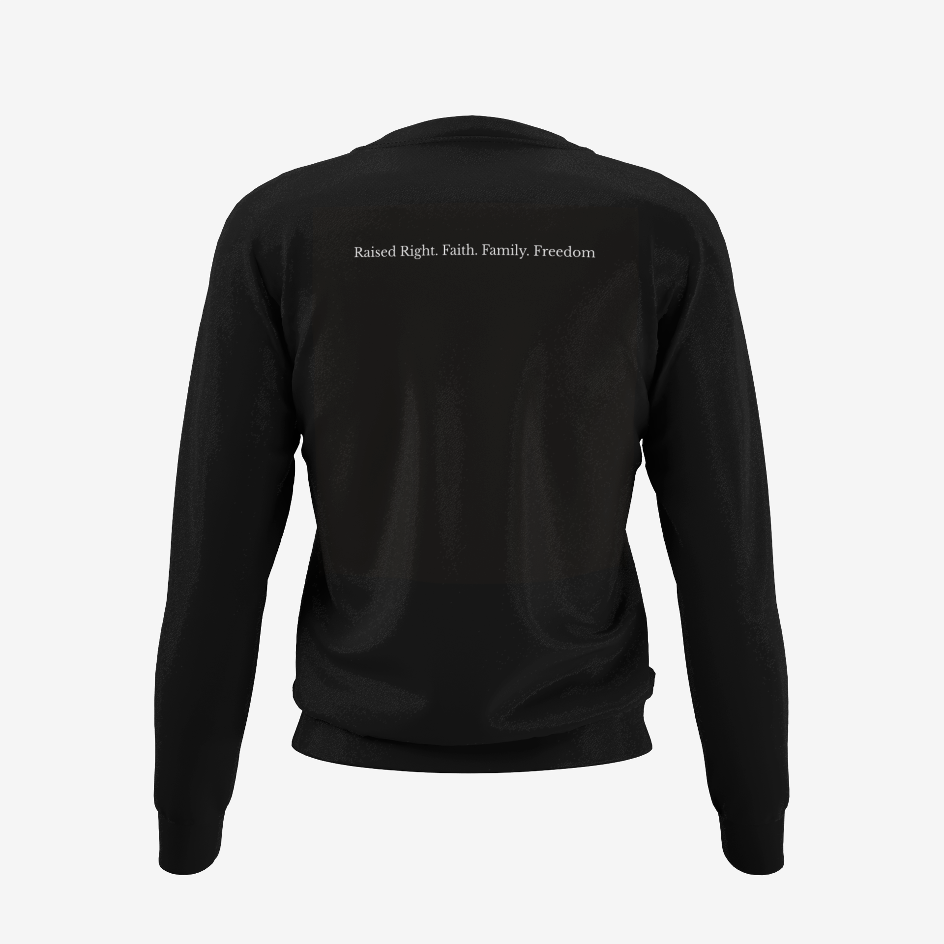 Show your roots proudly with our Raised Right Crewneck — a clean, bold statement piece for those grounded in faith, family, and true American values. The front features a sharp minimalist “RAISED RIGHT” design with patriotic red-and-white accents, while the back carries the full message: “Raised Right. Faith. Family. Freedom.” Crafted in deep black with crisp contrasting print, this crewneck is soft, warm, and built for everyday wear. Whether you're out with friends, at an event, or representing what you stand for online — this piece says it all without saying too much.